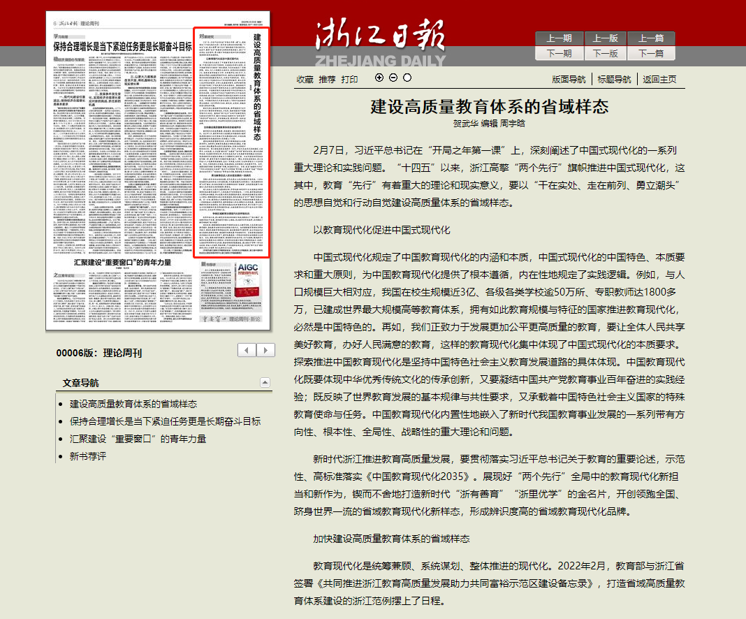 《浙江日報》2023年2月20日第6版全文刊發了我院賀武華教授的文章:《建設高質量教育體系的省域樣態》,全文如下: