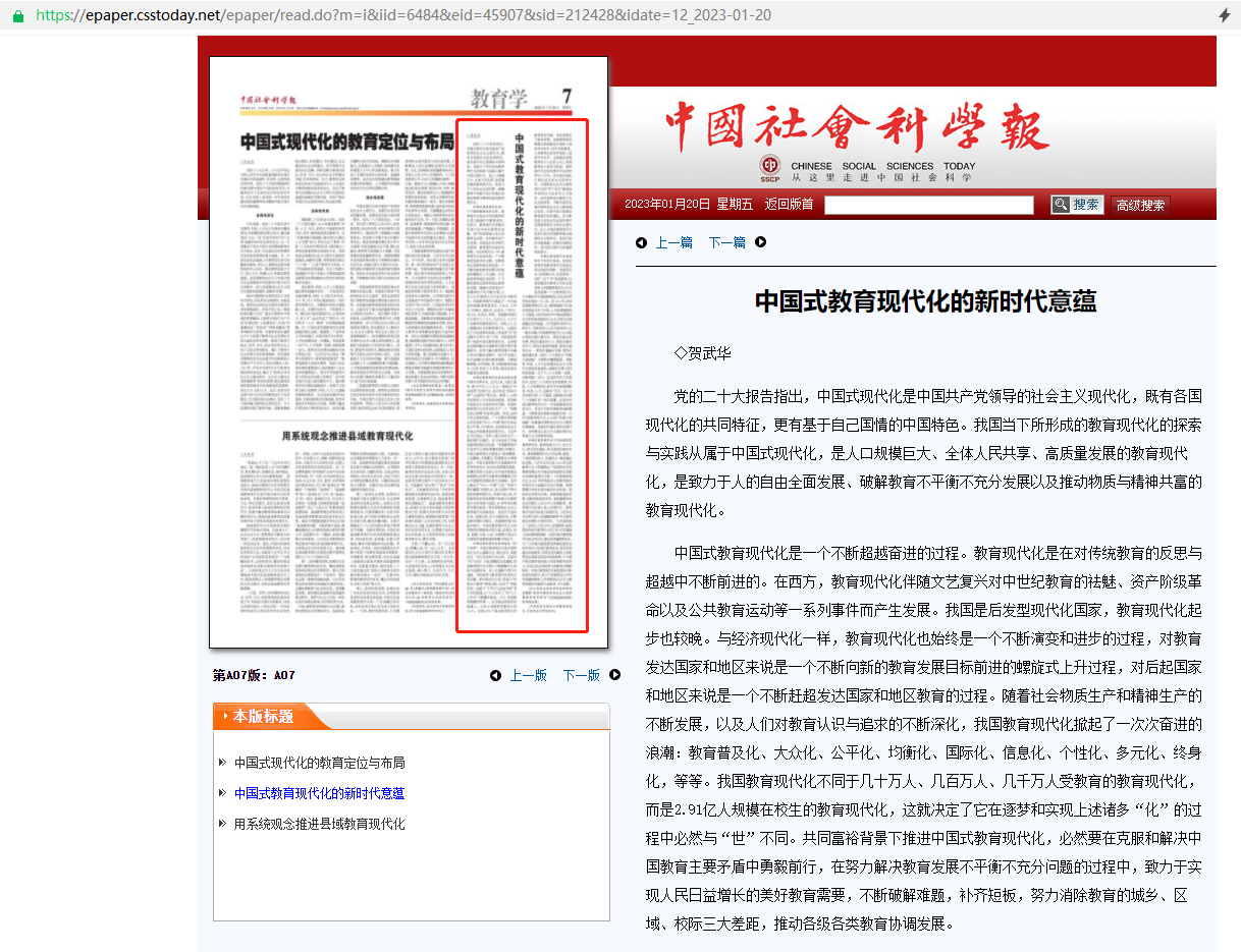 《中國社會科學報》2023年1月20日刊發了我院賀武華教授的文章:《中國式教育現代化的新時代意蘊》,全文如下: