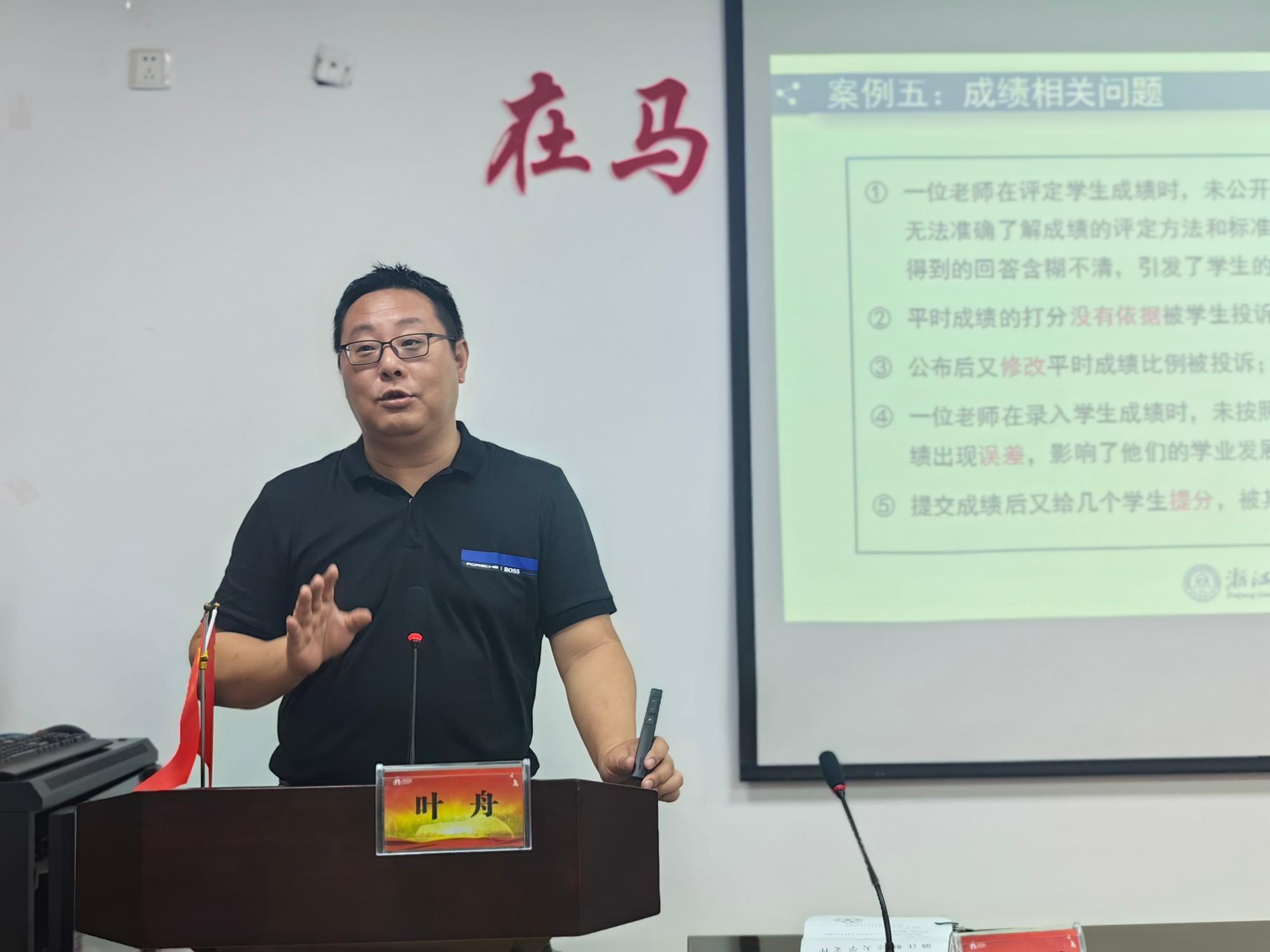 最后,教務處副處長葉舟受邀為我院作題為“教學工作規范與教學事故防范”的培訓會。葉舟圍繞“課堂教學注意事項”“教師監考注意事項”“教師言行注意事項”三個方面就我校教學規范和本科教學質量提升進行講解。葉舟以案說理,結合《浙江財經大學教學事故認定及處理辦法》以及近年來發生在我校的各類教學事故,詳細解讀了各個教學環節的教學事故風險和注意事項,尤其強調了教師遲到早退、言行失范、監考不負責任等現象的危害,幫助老師們快速了解學校的教學工作規程、教學事故認定與處理辦法等教學規范相關內容。葉舟副處長還結合自身長期教學工作經驗,就如何落實教學常規、提升課堂教學質量進行了詳實的講解和指導,并強調了師德師風的重要性。